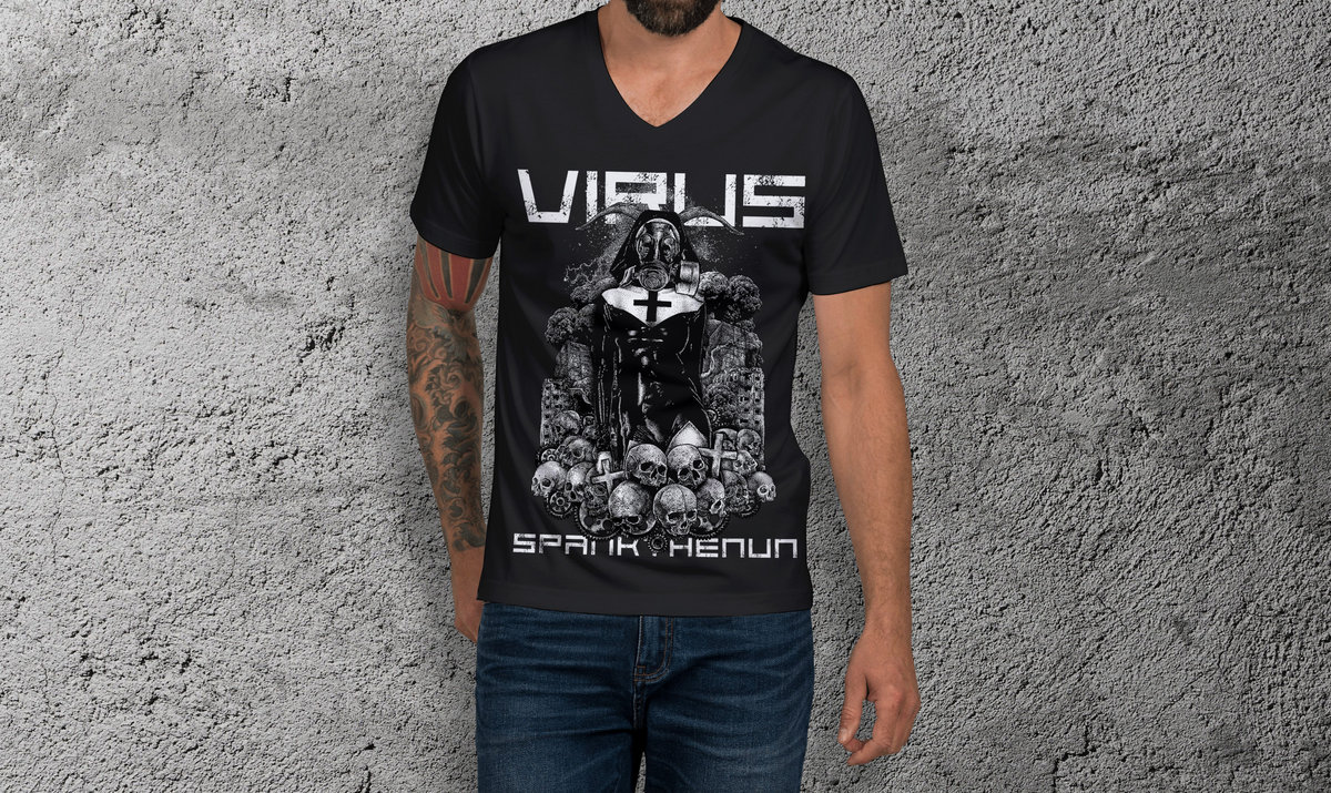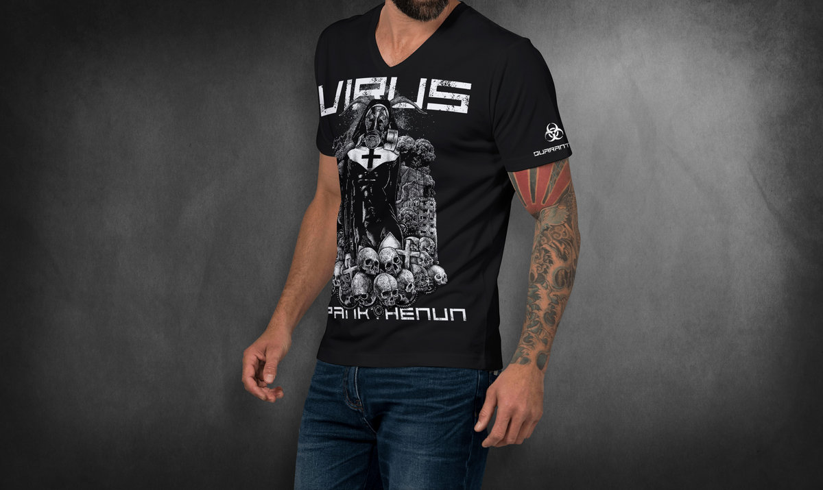 This is the print all over version of the VIRUS design, with larger graphics and an extra quarantine graphic on the left sleeve. Super soft, comfortable and printed with water based inks so you wont feel the ink at all.